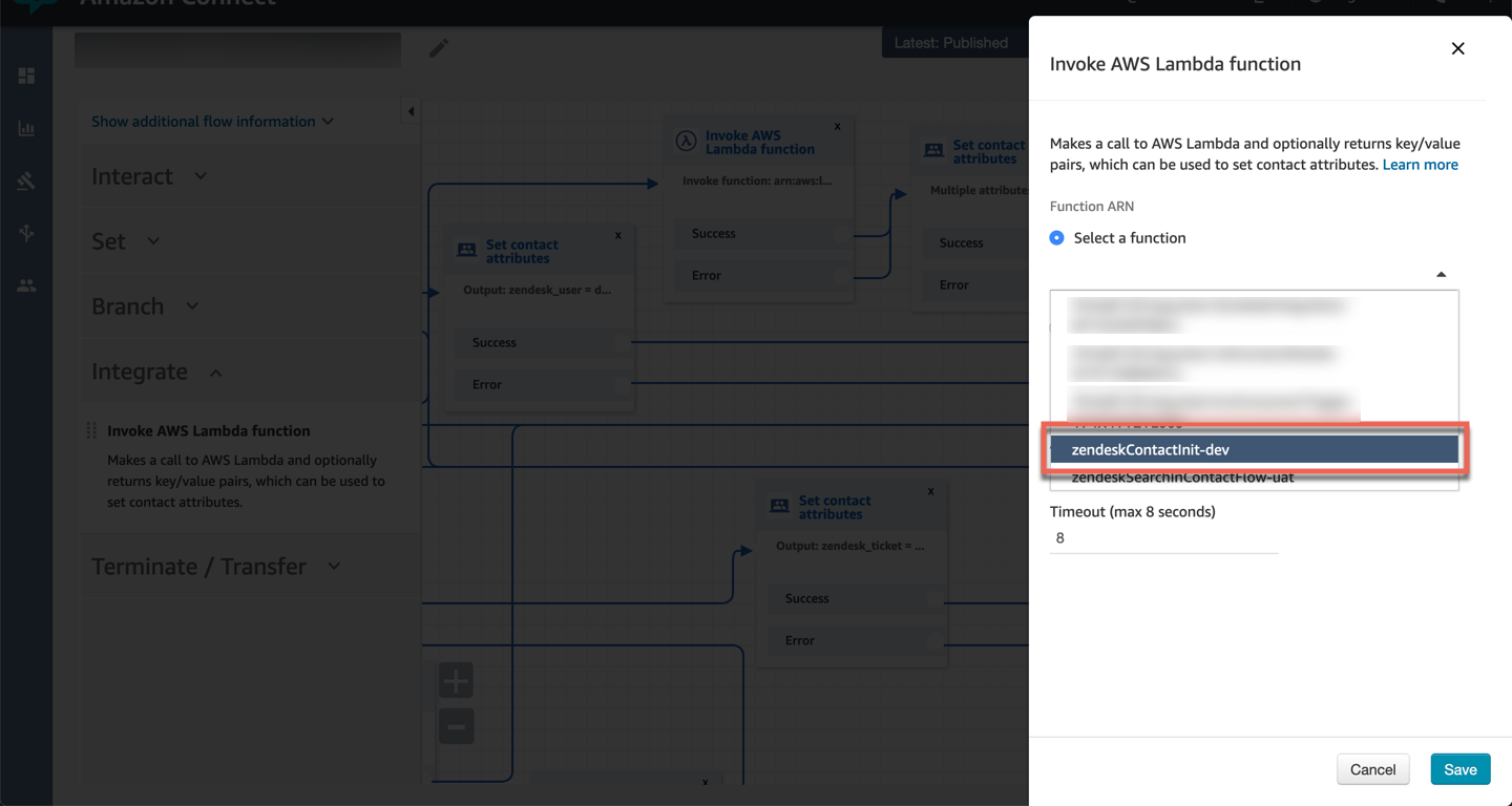 Go to you contact flow. Click on Integrate and drag and drop the Invoke AWS lambda function block onto your contact flow.