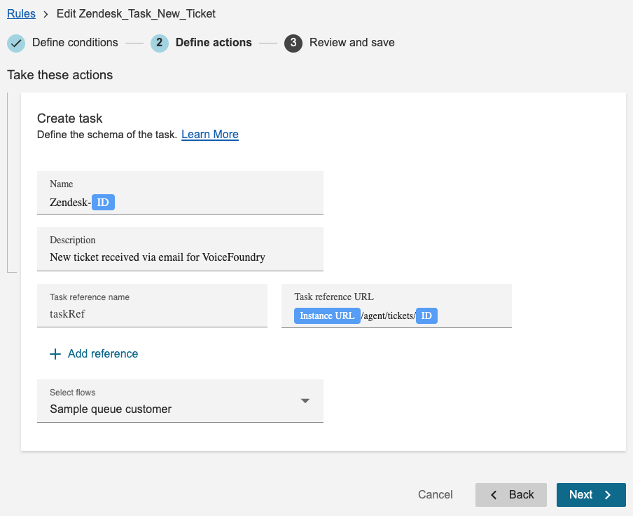The default configuration after installation handles only the Ticket created event. It will create a task for each new, unassigned ticket. The task will have all the attributes as per the phased-out Zendesk EventBridge integration. You can use the attribute values to decide when and where to route the task.
