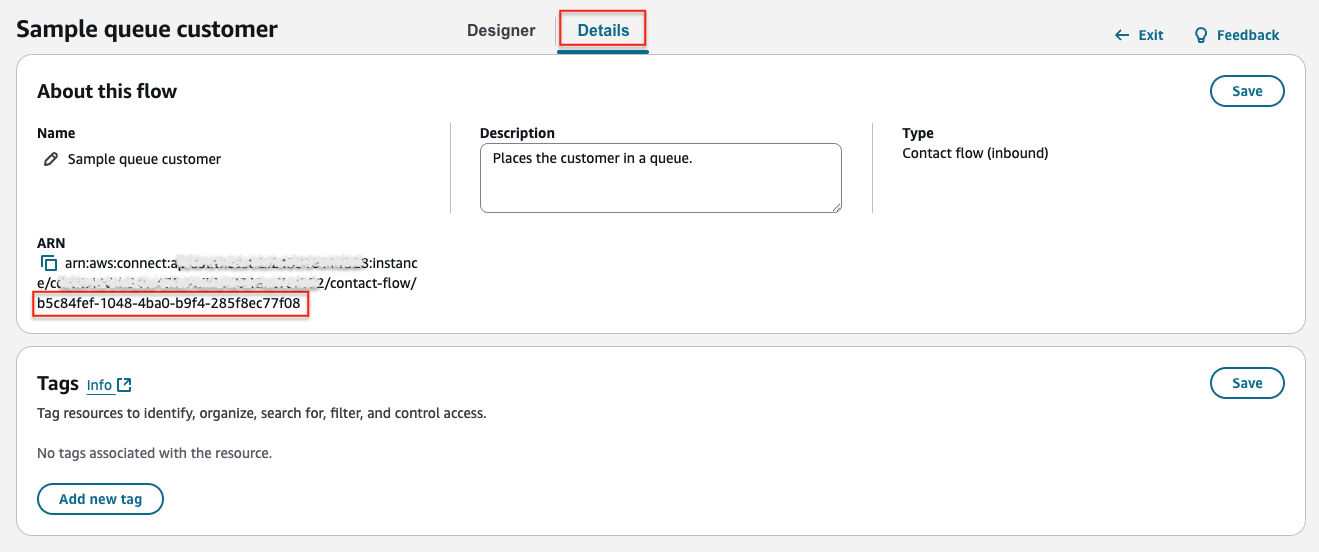 To get the contact flow ID of your selected contact flow, log into your Connect console, navigate to the selected contact flow and switch to the Details tab. Select and copy the last part of the ARN (after the last /):