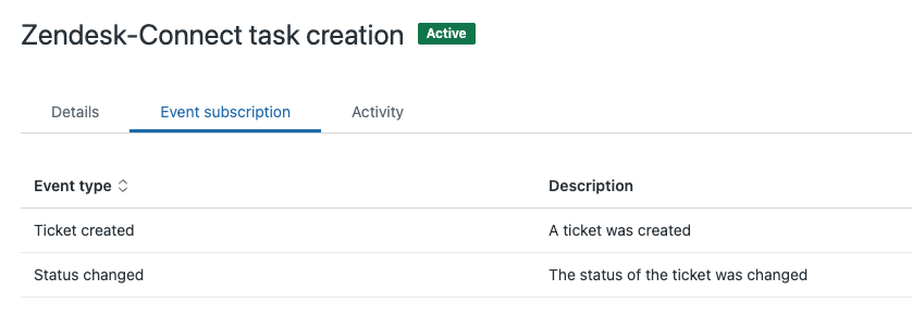 When the installation is complete, you should see a new Zendesk webhook in your admin portal with two Zendesk Support events triggering it: