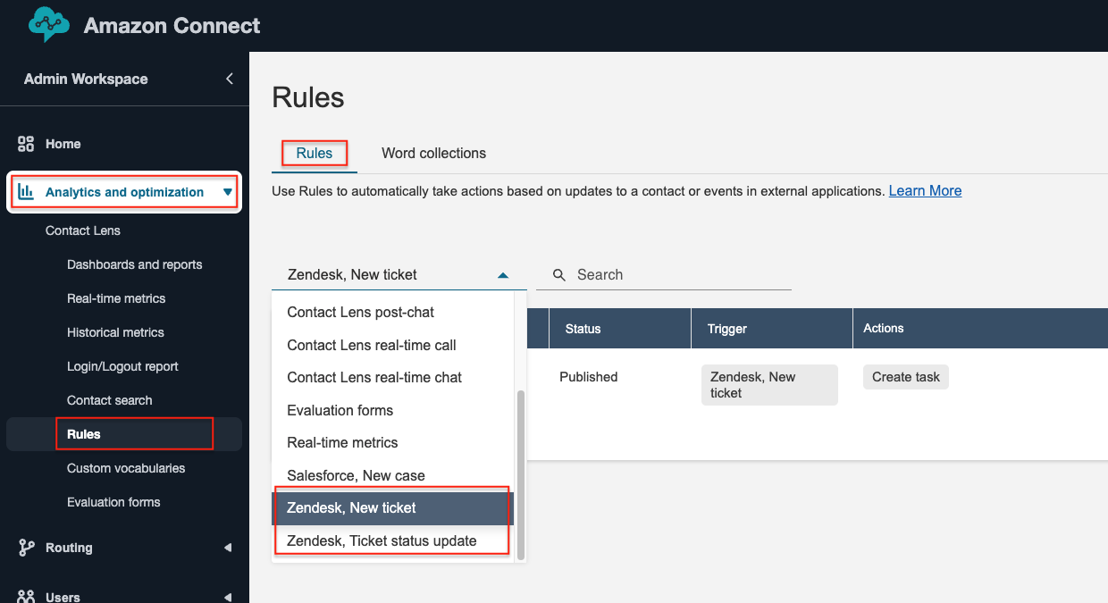 To see your existing task creation rules, open your Connect console and navigate to Analytics and Optimisation/Rules. From the rule type dropdown select one of the two Zendesk ticket events and then open the rule you want to convert.
