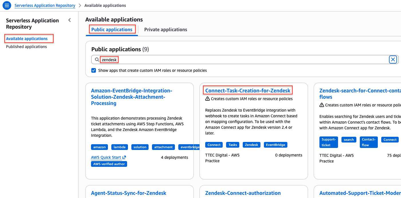 Under Public applications, select the checkbox Show apps that create custom IAM roles or resource policies.