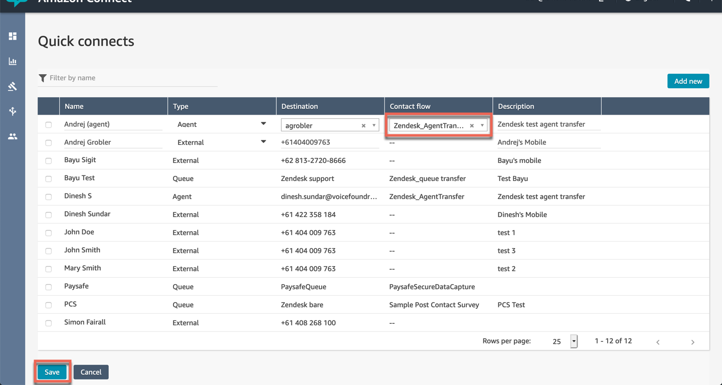 For every agent in the list, set the contact flow to Zendesk_AgentTransfer, then click on save.