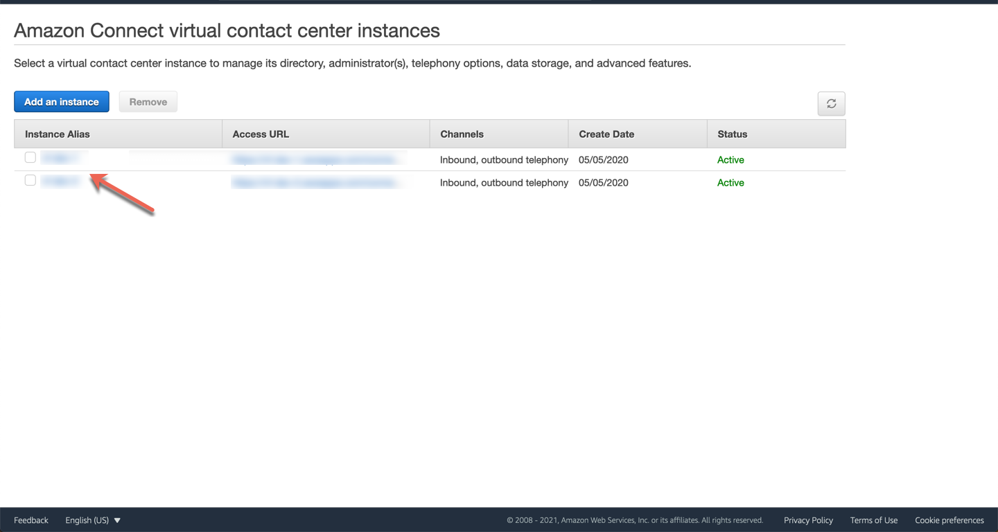 You will need to enter the name of the S3 bucket that call recordings from your Connect instance are being stored in. To find the name of the S3 bucket for your Connect instance, search for and select Amazon Connect within your AWS account. Select your Connect instance.