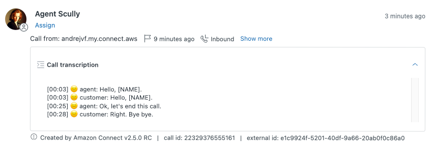 NOTE: The Amazon Connect app for Zendesk only supports analysis of redacted call recordings.