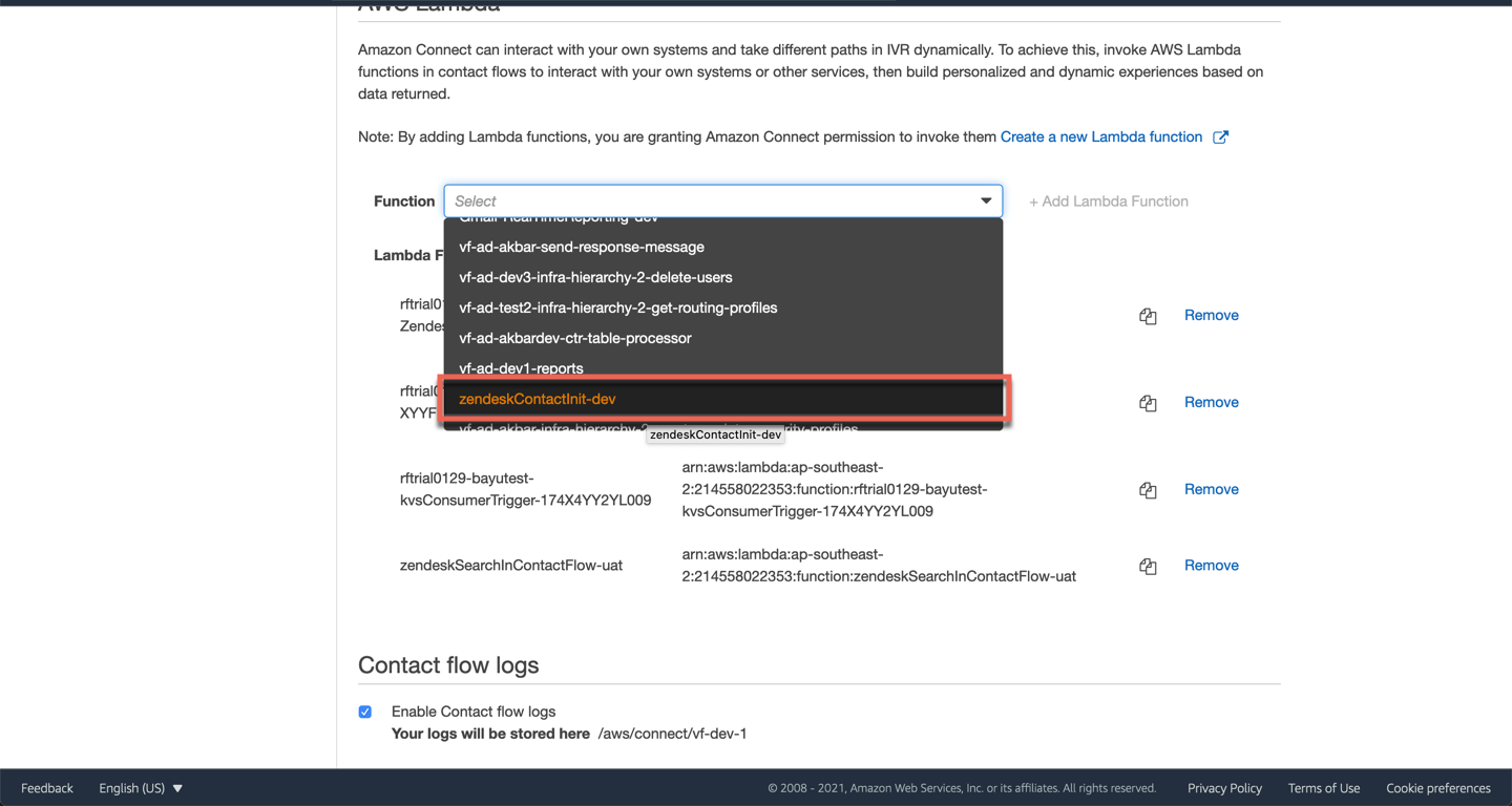 Click on the Invoke AWS lambda function block, select the lambda that was created during your stack and then click Save. Note, if you’re using the provided contact flow module, you need to update the lambda reference there in the same way.