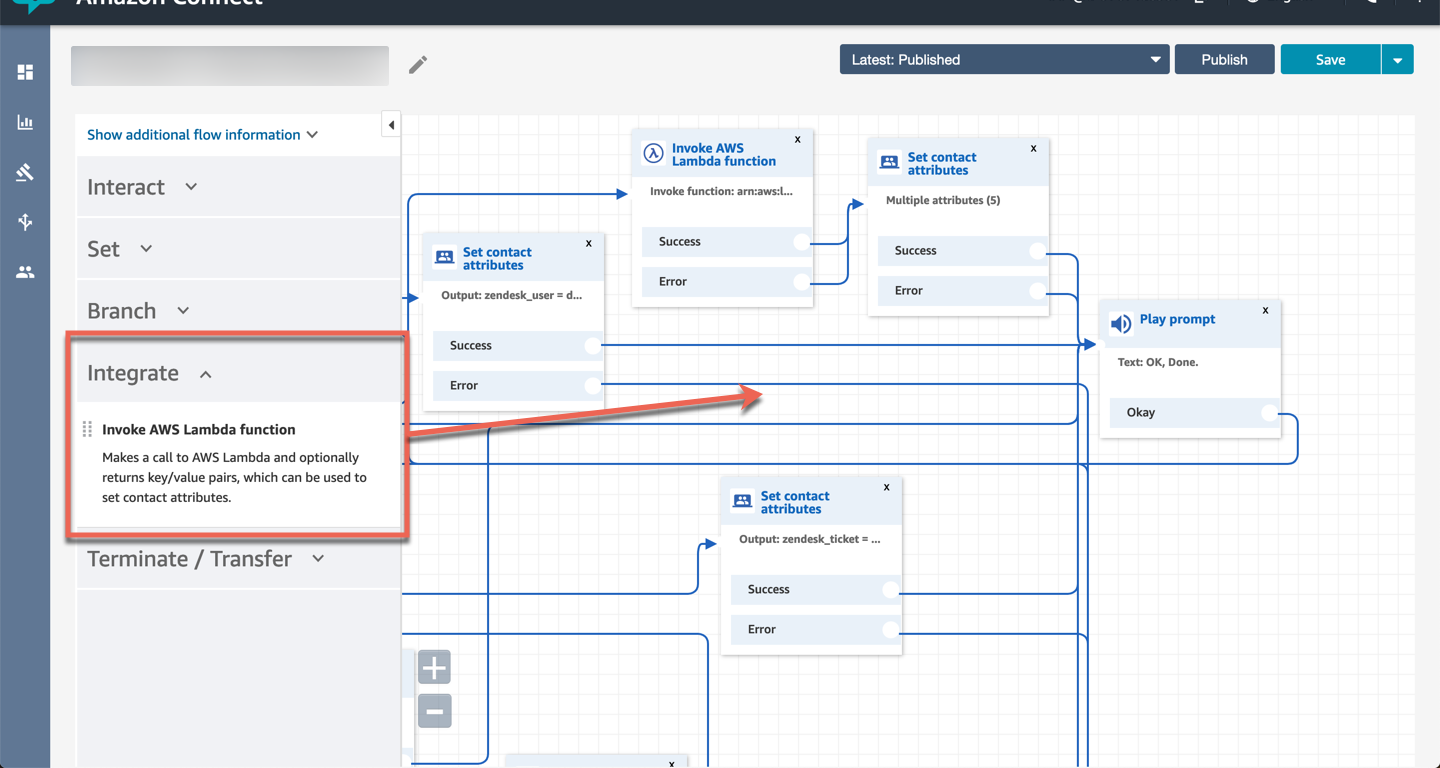 Go to you contact flow. Click on Integrate and drag and drop the Invoke AWS lambda function block onto your contact flow.