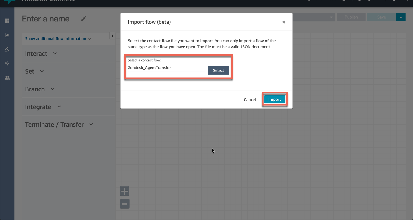 Click on select and choose the file Zendesk_AgentTransfer.json from your desktop. Click on import.