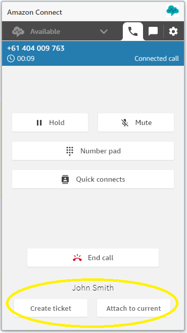 This is achieved through a contact attribute named ticket_assignment. Without setting this attribute, the app is in a default auto assignment mode where ticket handling is automatic, as described so far. When this attribute is set to agent though, tickets are no longer created or assigned automatically. Instead the agent uses the extended softphone user interface to manually create them, or attach the call to selected, existing ones.