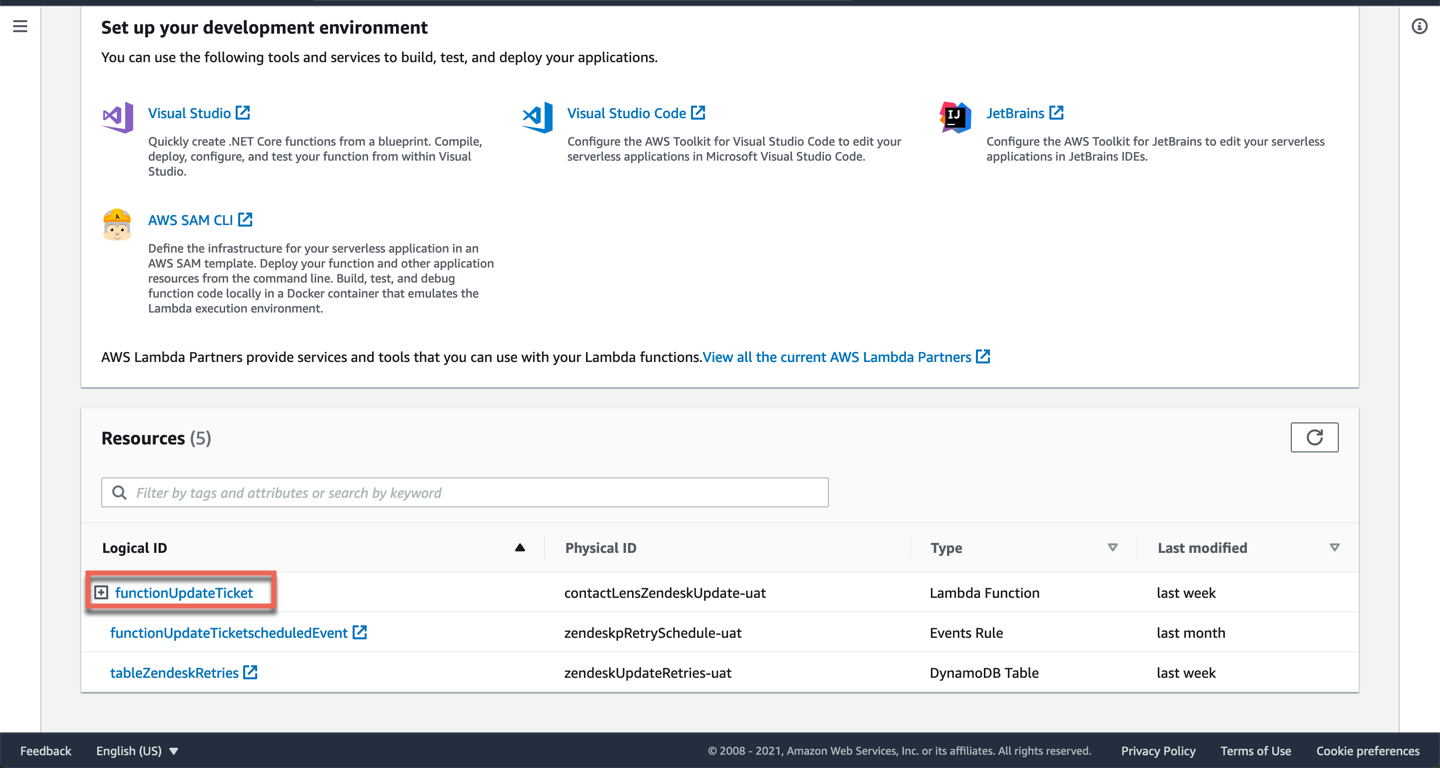 Once the stack has successfully been deployed, scroll down and click on functionUpdateTicket.