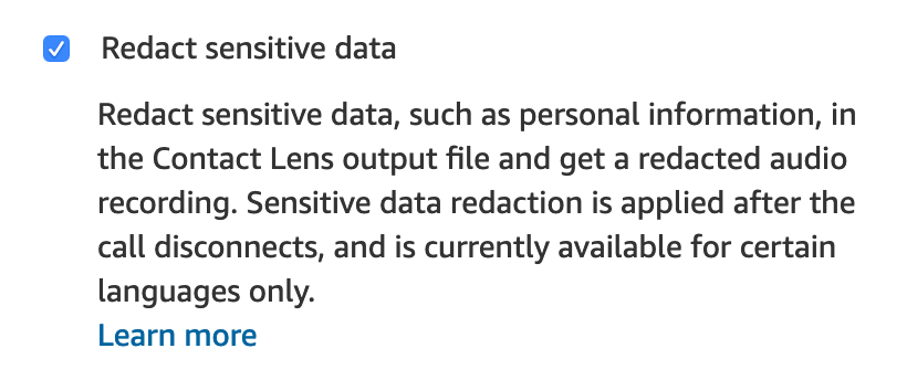 NOTE: The Amazon Connect app for Zendesk only supports analysis of redacted call recordings. As such please ensure that the following checkbox is ticked within the Set recording and analytics behaviour block in your inbound and outbound contact flows, otherwise you will not be able to attach Contact Lens' speech analysis to any of your tickets.
