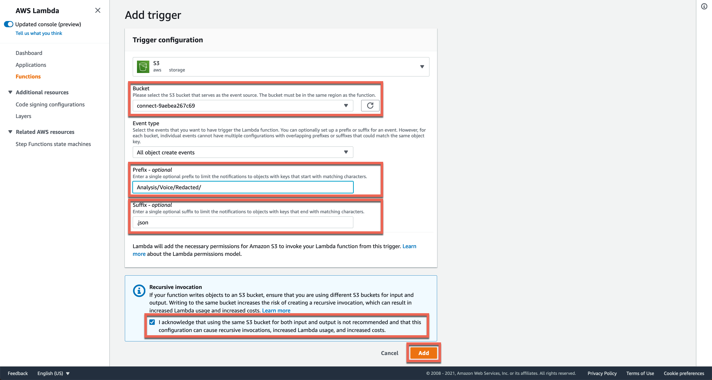 In the Bucket field select the S3 bucket that call recordings from your Connect instance are being saved in.