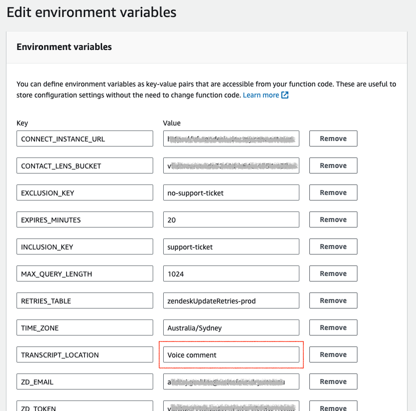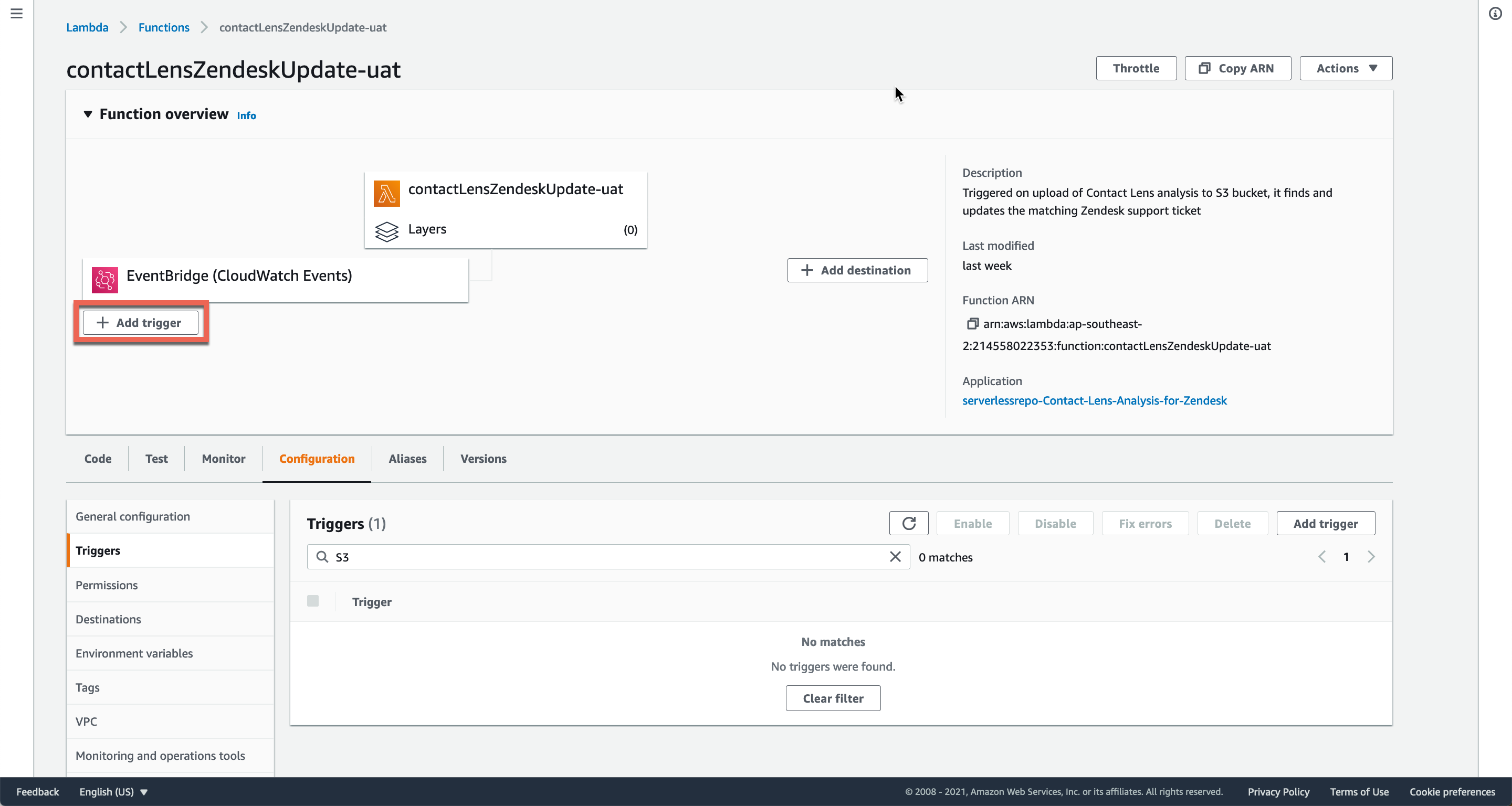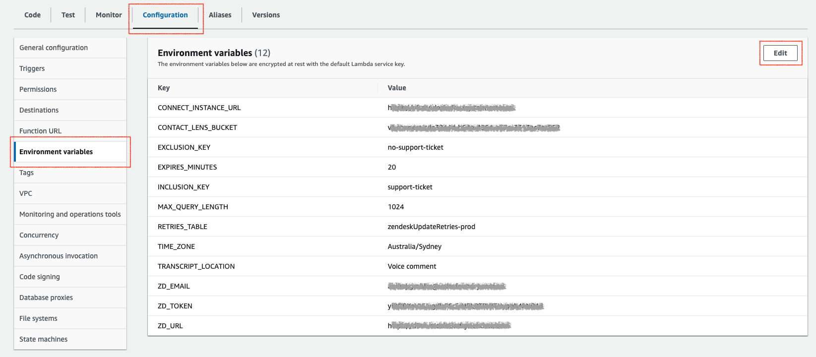 Find your Zendesk Contact Lens Lambda by searching for phrase “contactLensZendeskUpdate” and open it.