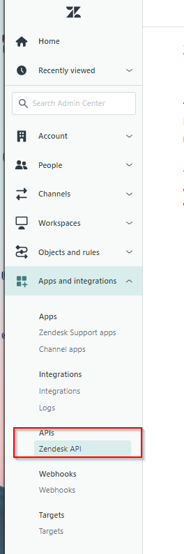 Sign in to your Zendesk instance. Click on Admin within the left hand navigation bar, and under Apps and Integrations select, “Zendesk API”