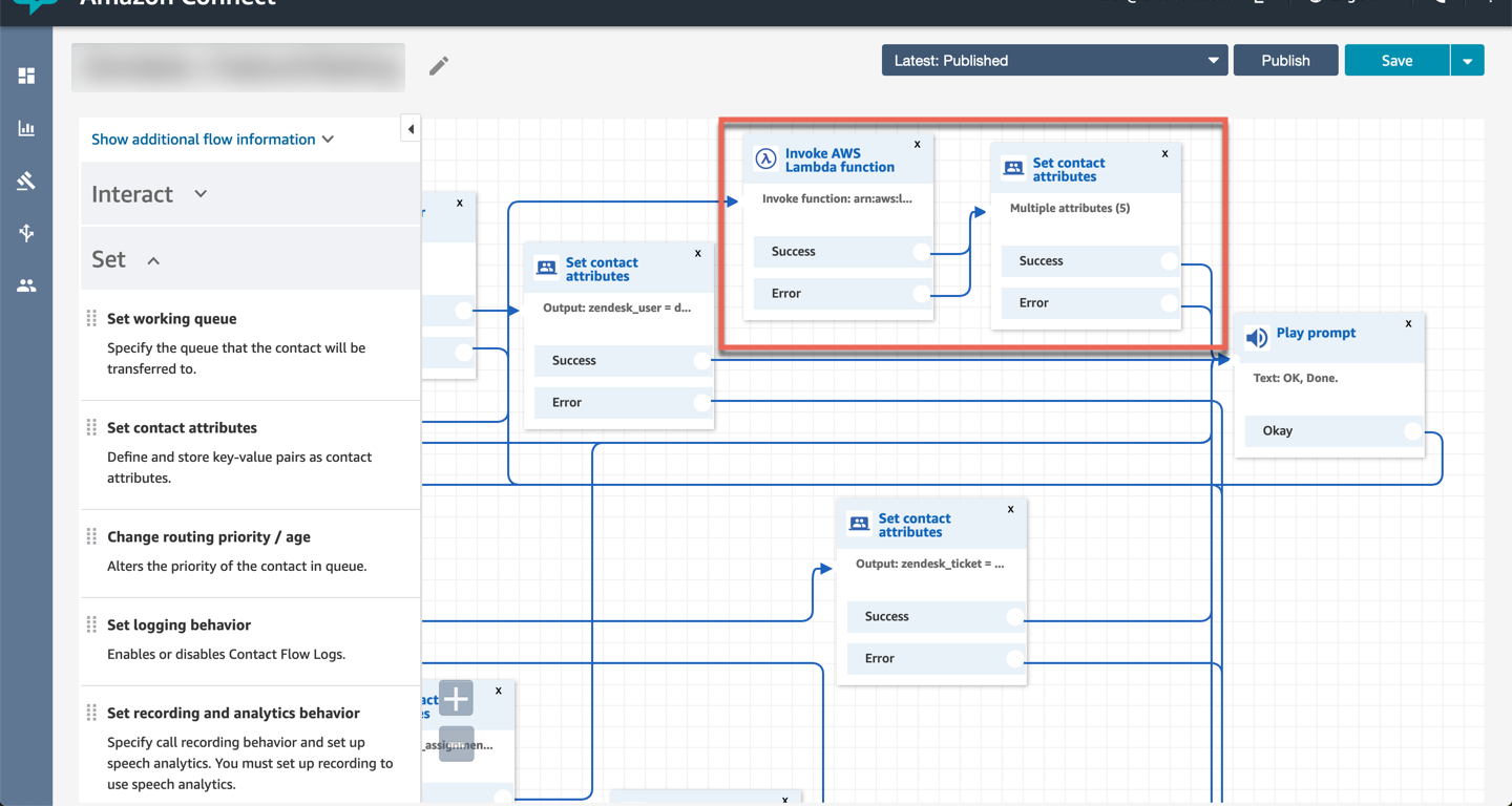 Click on the Invoke AWS lambda function block, select the lambda that was created during your stack and then click Save. Note, if you’re using the provided contact flow module, you need to update the lambda reference there in the same way.