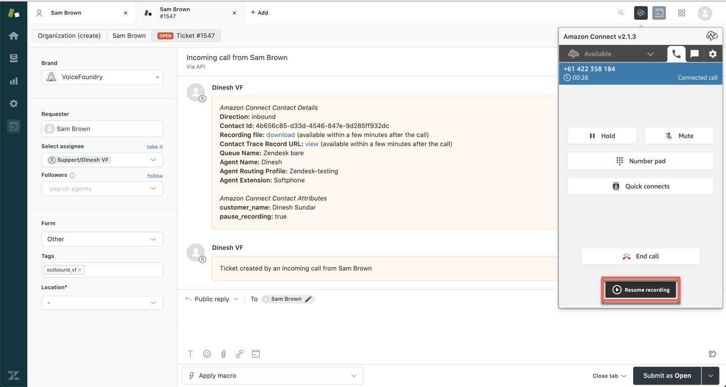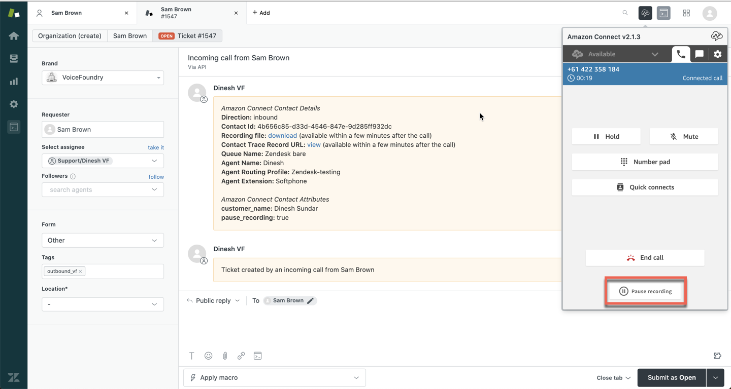 Once an agent is connected with a caller, they can pause the call recording by clicking on the Pause recording button within the softphone.