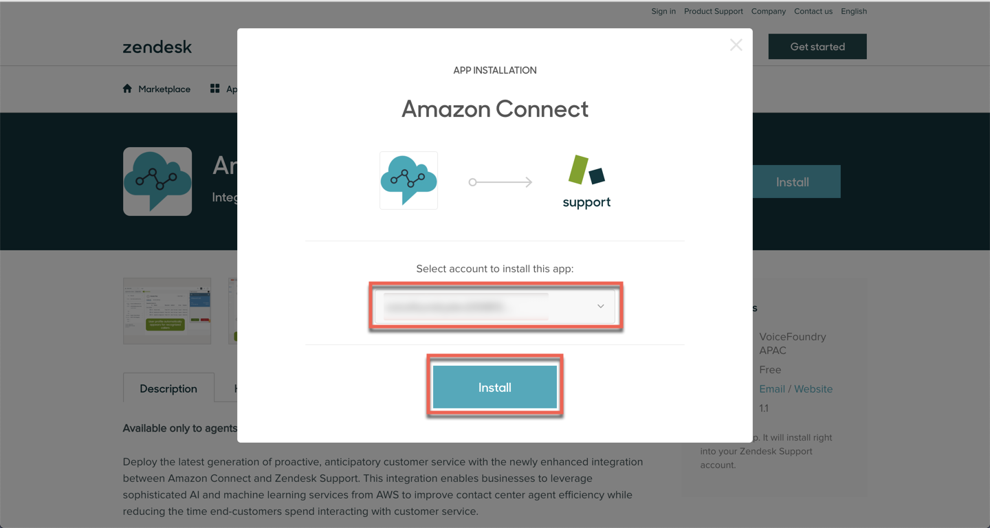 Search for the Amazon Connect app in the Zendesk Marketplace and click on install.
