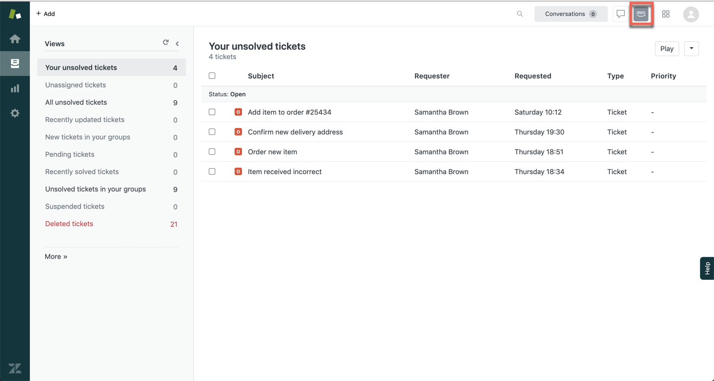 Click on the Amazon Connect app icon in the top right corner of your Zendesk instance.