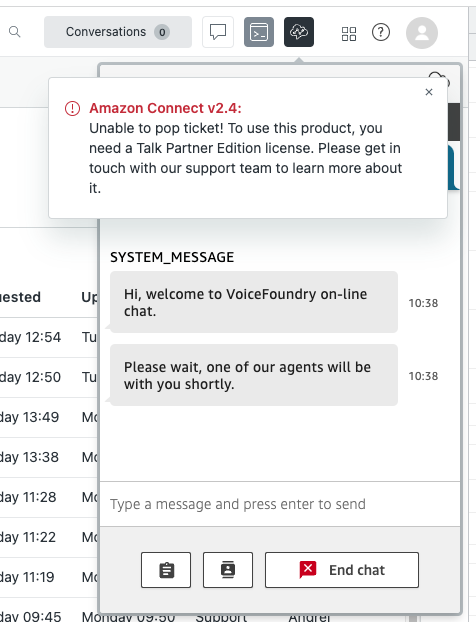 To use the Amazon Connect app with Zendesk Support you need a valid Talk Partner Edition (TPE) license. Without it the app will not be able to show (pop) a recognised user on incoming call, or create a ticket. Instead, it will display a warning similar to the screenshot below: