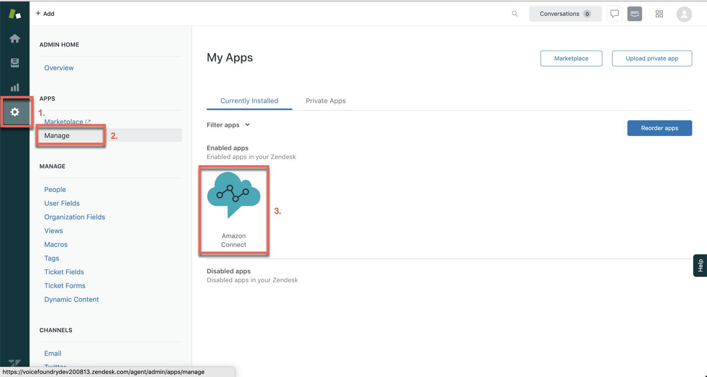 The app’s settings are configured in Zendesk. To view/edit the app’s settings, go to your Zendesk instance. Click on the admin icon in the left navigation bar, and under apps select manage. Click on the Amazon Connect app.