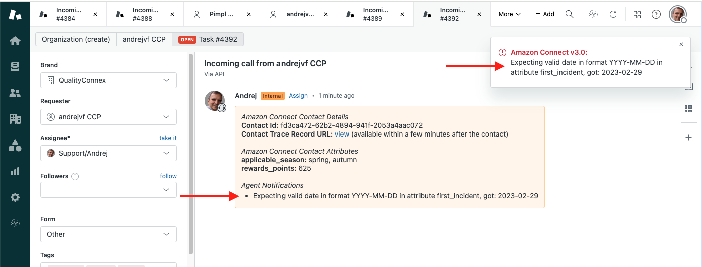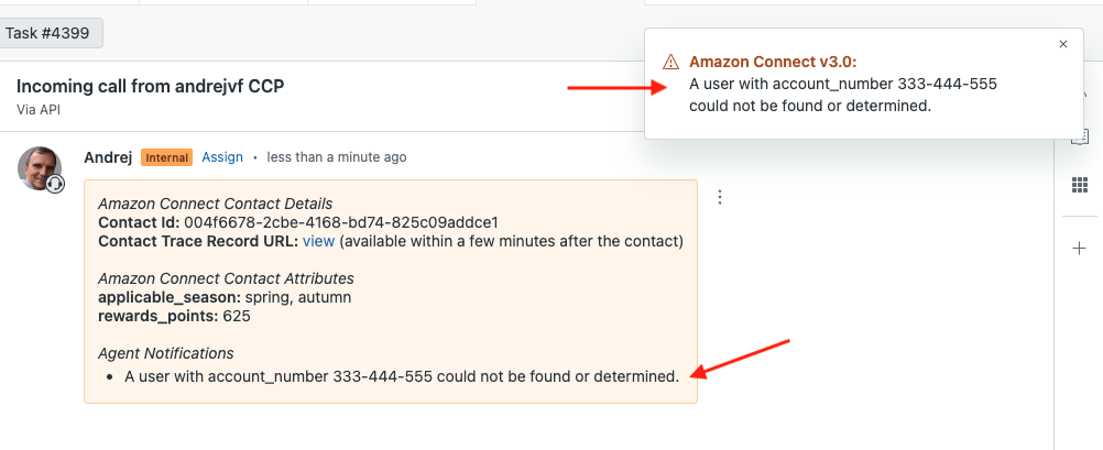 Alternatively, if the Zendesk search API is not used and your LEX bot just retrieves the customer’s name, this can be used to search for the customer as well. To do this, pass through the customer’s name through the custom attribute customer_name. If a single customer match is found, that customer’s user profile will pop for the agent. If there are multiple matches with the same name or email, the app will change its ticket assignment behaviour to agent and a notification message will pop, suggesting to the agent to do a search within Zendesk and select the appropriate user profile.