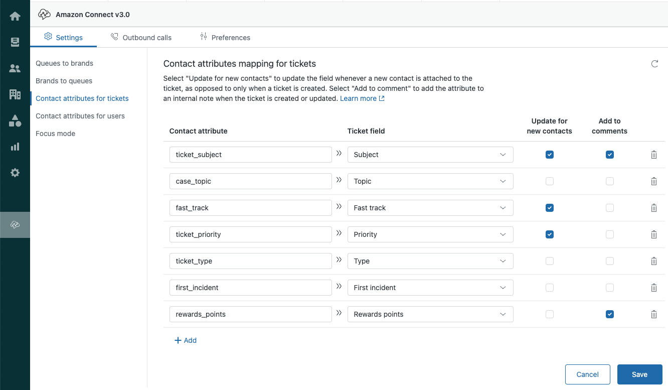 The mapping between Amazon Connect Attributes and Zendesk standard or custom ticket fields is done via settings screen. Each record in this mapping includes the contact attribute’s name, selected ticket field and Update and Comments flags. Example: