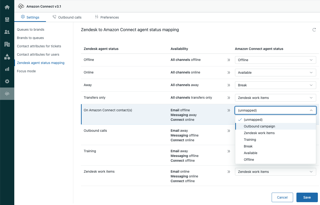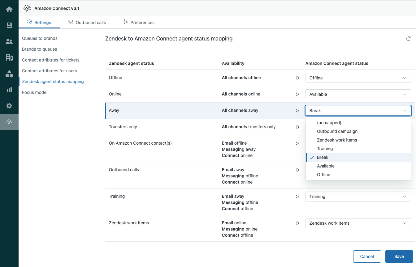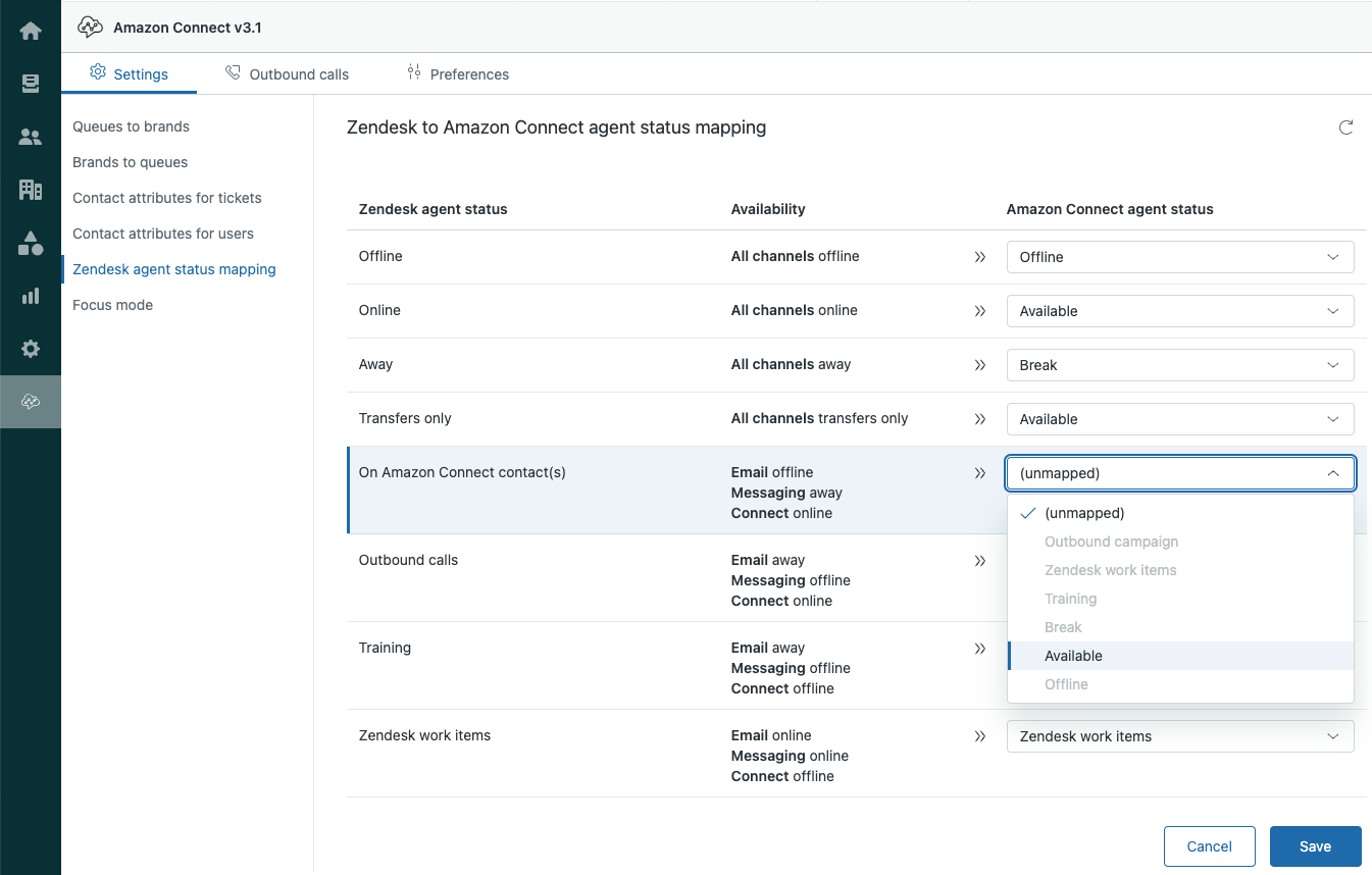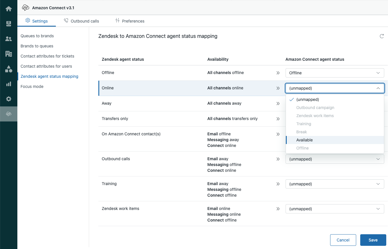 When Focus mode is not activated however, the mapping of the designated Zendesk status to any of Connect statuses can be changed: