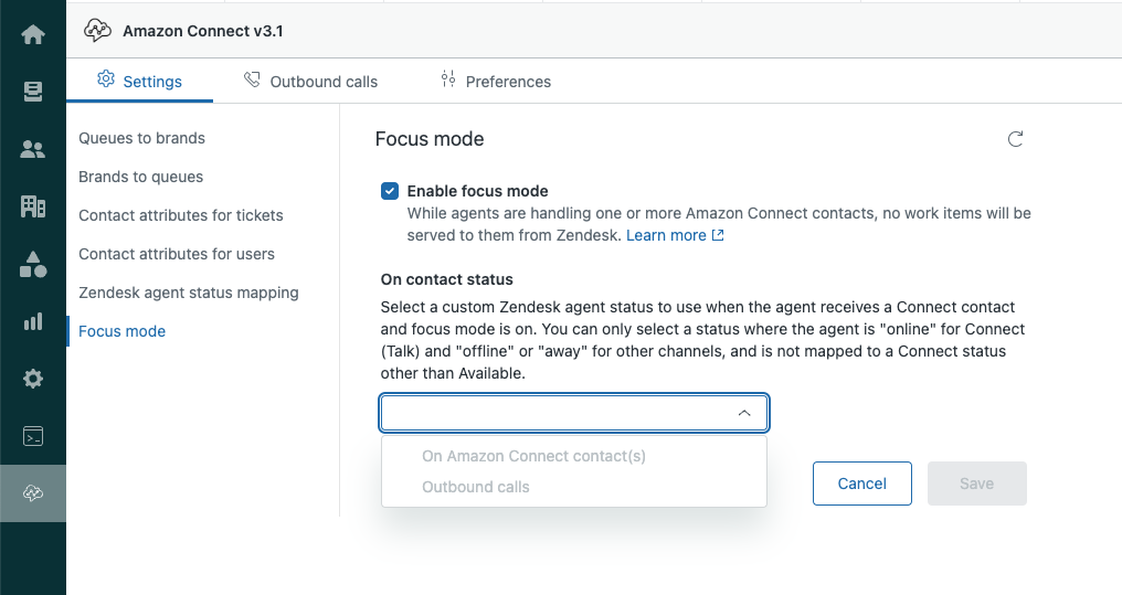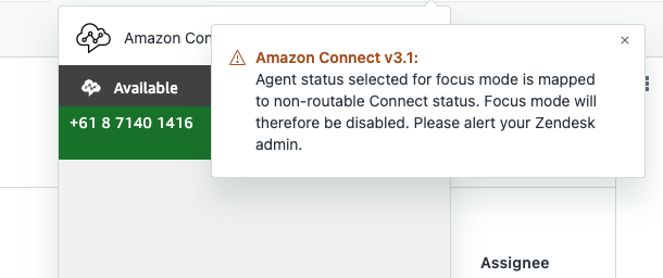 When Focus mode is turned on your agents won’t be served any Zendesk work items while they’re handling an Amazon Connect contact.
