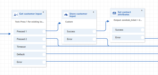 • Specifying the ticket number within the contact (IVR) flow and passing that value to the app via a contact attribute. This requires adding a simple input block to the contact flow and then assigning the input value to a contact attribute. Name of that attribute defaults to zendesk_ticket but can be changed in the application settings. The app verifies the ticket number, making sure it’s valid and that it belongs to the calling user. If that validation fails a new ticket will be created instead.