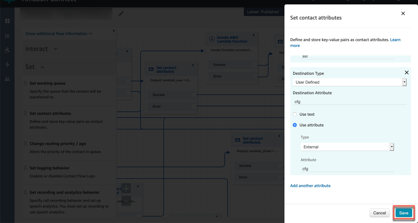 Click on the Invoke AWS lambda function block, select the lambda that was created during your stack and then click Save. Note, if you’re using the provided contact flow module, you need to update the lambda reference there in the same way.