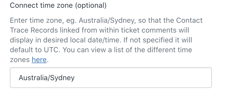 Enter your time zone, eg. Australia/Sydney, so that the Contact Trace Records linked from within ticket comments will be displayed in your local date/time. If this is not specified it will default to UTC. You can view a list of the different time zones here.